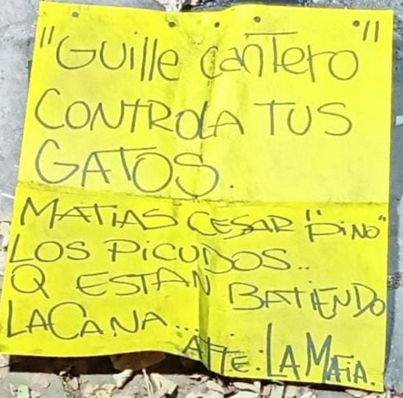 "Guille Cantero controla los gatos, Matías Cesar Pino. Los picudos que están batiendo la cana. Atentamente La mafia", dice el mensaje escrito a mano en un papel que fue dejado en el lugar.