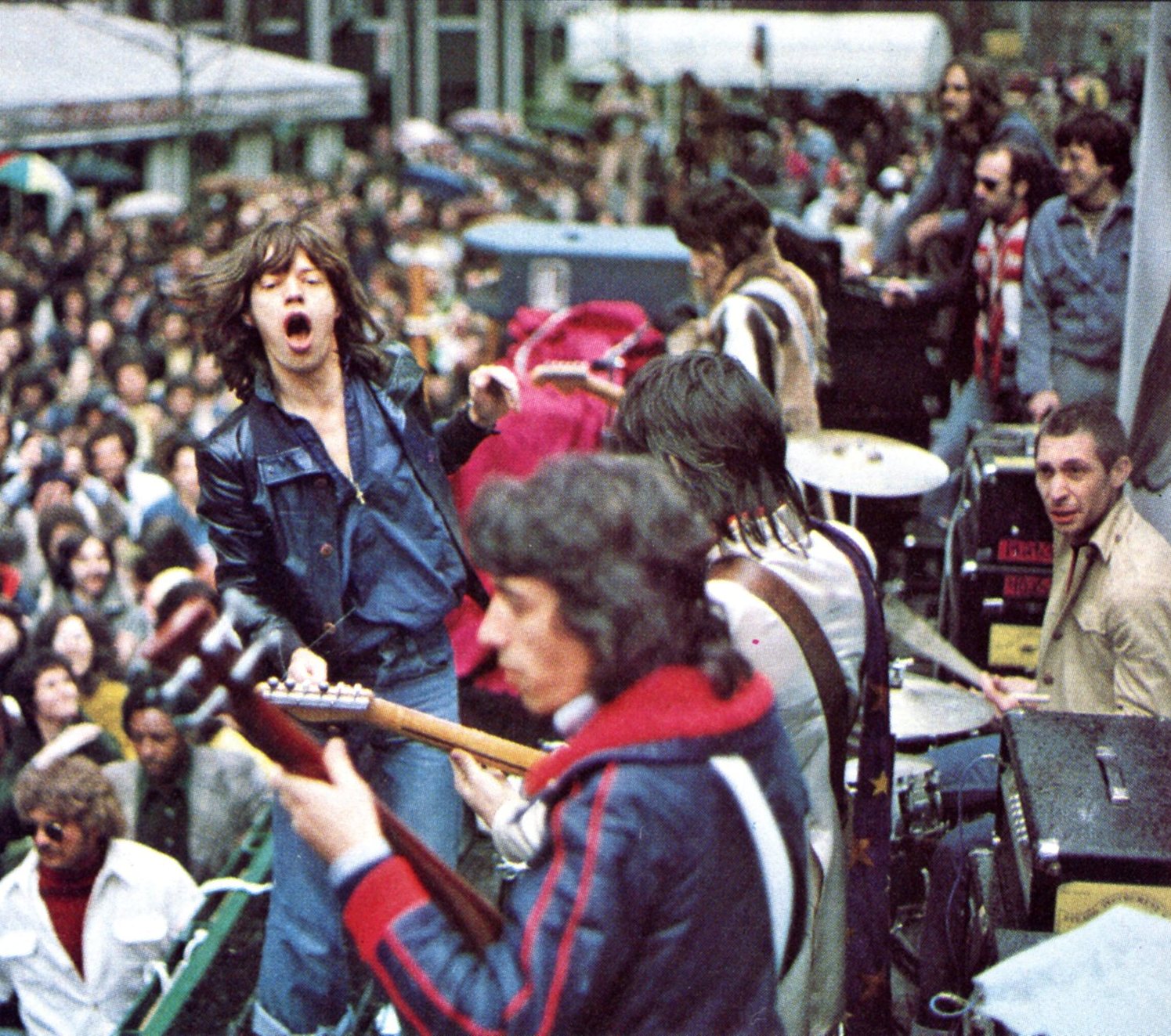 El puñado de curiosos que estaban fuera del hotel, que habían escuchado un rumor de la conferencia de prensa y que esperaban vislumbrar a los Stones entrando en el hotel, vieron en cambio un camión de plataforma rodando por la Quinta Avenida llevando los Stones, sus instrumentos y una pared de amplificadores. El camión se detuvo frente a la entrada del hotel y la banda tocó una versión extendida de " Brown Sugar ". Charlie Watts había sugerido esta adaptación de un truco promocional utilizado a menudo por los músicos de jazz de Nueva Orleans ; la idea fue posteriormente emulada por grupos como AC / DC y U2. Después de que los Stones terminaron la canción, la camioneta bajó por la Quinta Avenida otra cuadra y la banda saltó a las limusinas. Nunca asistieron a la rueda de prensa.