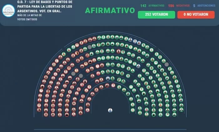 Tras 21 horas de debate, la Cámara de Diputados aprobó en general la Ley de bases y puntos de partida para la libertad de los argentinos. Cerca de las 9 de la mañana, el proyecto reunió 142 votos a favor, 106 en contra y cinco abstenciones. El acompañamiento del grueso de los bloques dialoguistas fue clave para la aprobación en general. Sigue el debate en particular y se despejaron las dudas en torno a un artículo clave.