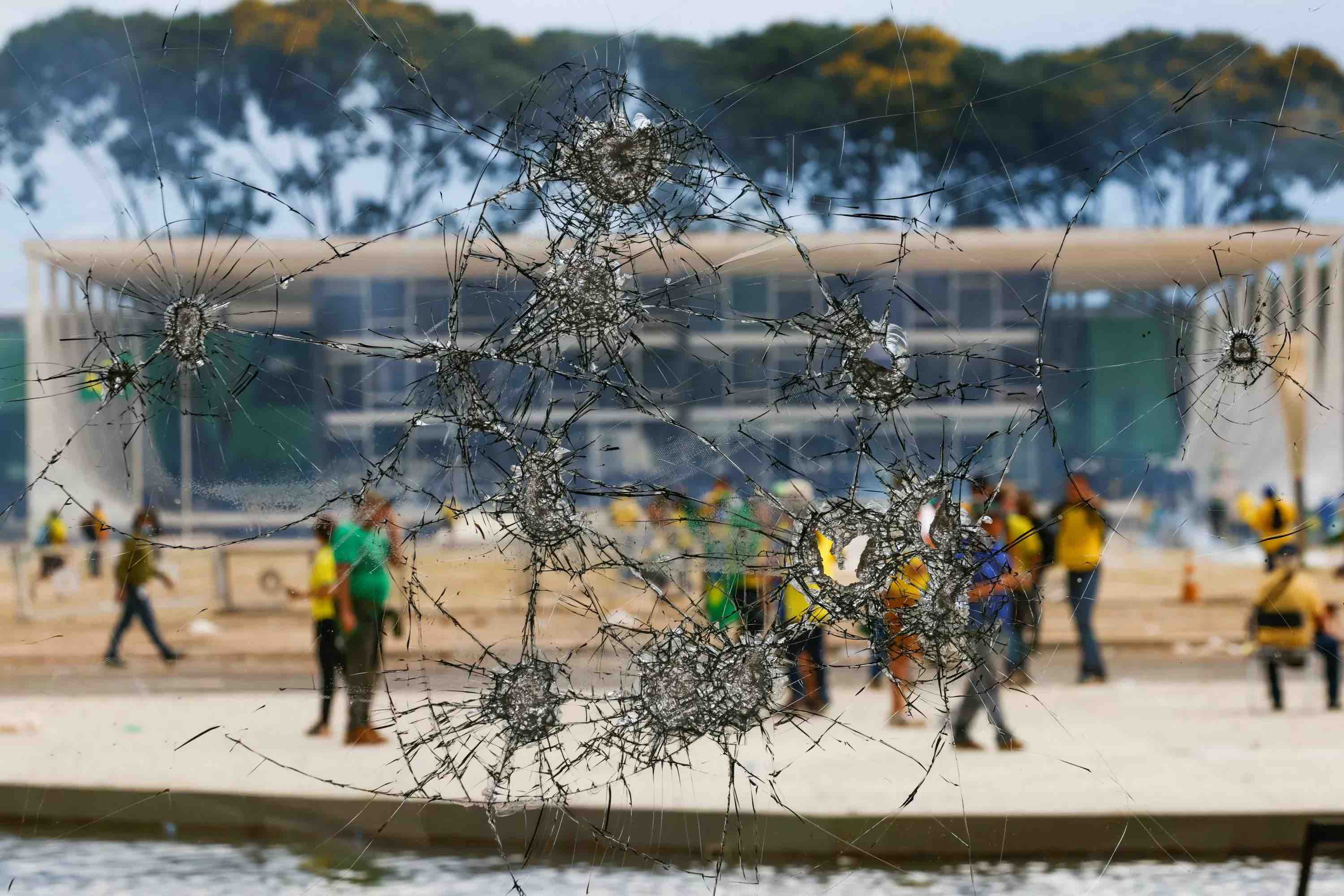 "Hemos recuperado las sedes de los tres poderes de la República, con daños gravísimos. Tenemos aproximadamente 200 detenidos en flagrancia" por los ataques a las sedes del Congreso, el Poder Ejecutivo y la Corte. "Detuvimos además unos 40 ómnibus que participaron en el transporte [de los manifestantes] Y vamos a encontrar a los financiadores", agrega Dino.