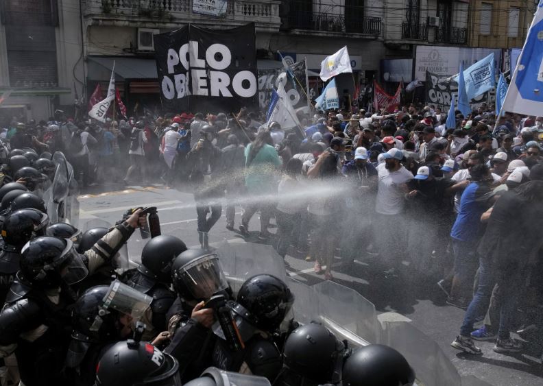 Miles de manifestantes de distintas organizaciones sociales exigieron este lunes en Argentina que se restablezca la entrega de alimentos a los comedores comunitarios públicos, mientras en la capital Buenos Aires se registraron incidentes con la policía, que debió utilizar gases y camiones hidrantes.